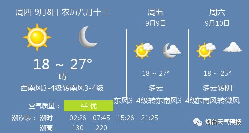早上好,今天是9月8日,星期四,农历八月十三。烟台天气:晴,温度 18 ~ 27℃,西南风3-4级转南风3-4级,日出时间 05:30,日落时间 18:14,降雨量 0.0mm,湿度 64%RH。实时:晴,气温 21℃,西南风4级,湿度 65%RH,气压 1014Pa,紫外线强度 1级,能见度 米。