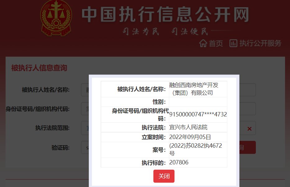 摘要:??乐居财经 孙肃博 9月5日,融创西南房地产开发(集团)有限公司被列入被执行人,案号为(2022)苏0282执4672号,执行标的为元,执行法院为江苏省无锡市宜兴市人民法院。 ??据企查查