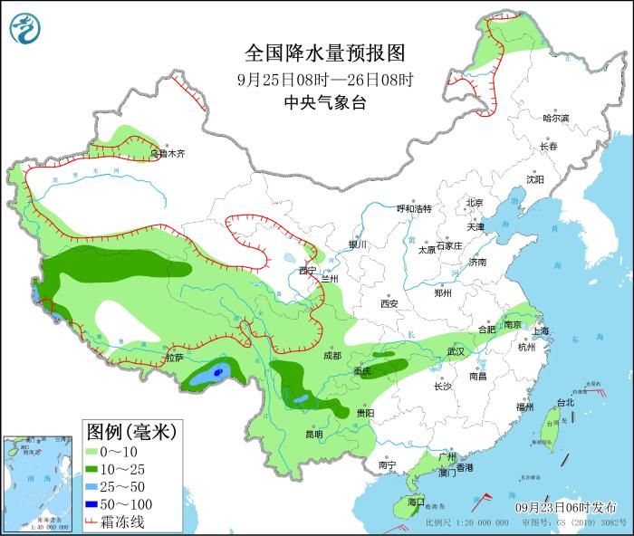 9月25日08时至26日08时,青藏高原大部、西南地区大部、长江中下游地区、华南南部等地部分地区有小到中雨,局地有大雨或暴雨。台湾海峡、巴士海峡、南海北部海域将有6~8级、阵风9~10级的偏北到东北风,其中南海东北部的部分海域风力可达9级、阵风10~11级。