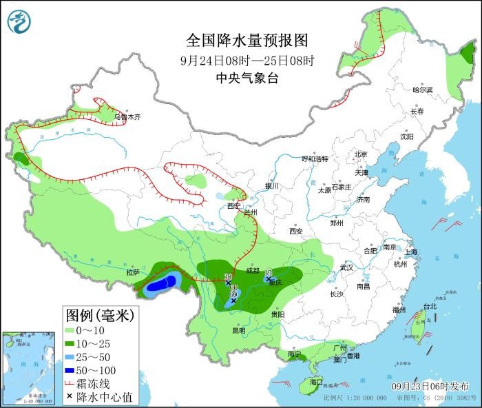 9月24日08时至25日08时,黑龙江东北部、西藏东南部、四川南部、云南北部、重庆中南部、贵州北部、海南东南部等地部分地区有中到大雨,其中,四川南部、西藏东南部等地局地有暴雨(50~60毫米)。内蒙古中东部、黑龙江东部和南部、浙江东部等地部分地区有4~5级风。东海大部海域、台湾海峡、台湾以东洋面、巴士海峡、南海东北部海域将先后有6~7级、阵风8级的偏北或东北风,其中台湾海峡部分海域的风力可达8级、阵风9级。