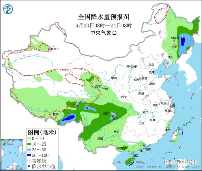 摘要:此外,23日至25日,华南南部部分地区有中到大雨,局地暴雨。 9月23日08时至24日08时,黑龙江南部和东部、吉林中东部、西藏东部、四川大部、重庆大部、云南西北部、海南岛等地的部
